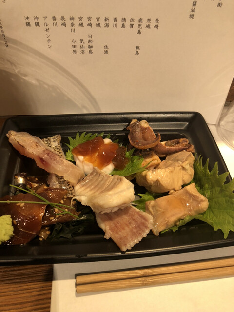 おつまみ:5品] かすべ煮つけ、鮪血合い生姜煮、ぼら味噌漬、 りゅうきゅう、蛸と野菜のマリネ