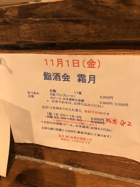 18:00〜19:45:酒代¥2,000、鮨代¥6,000