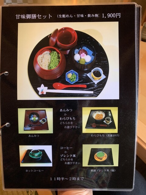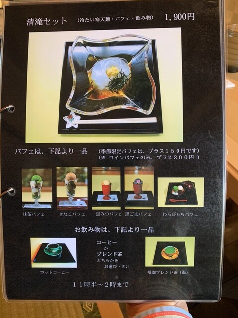 今回、ランチの時間帯に来店できたので、ランチメニューを注文しました。ランチメニューは、軽食(生麩めん or 磯辺餅 or 寒天麺)+パフェ+飲み物のお得なセットです。