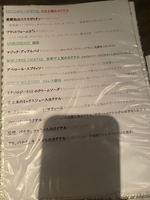 オリジナルのミクゾロジーカクテルがとても豊富な松山のバー。味の想像のつかないカクテルが多くとても楽しかった。