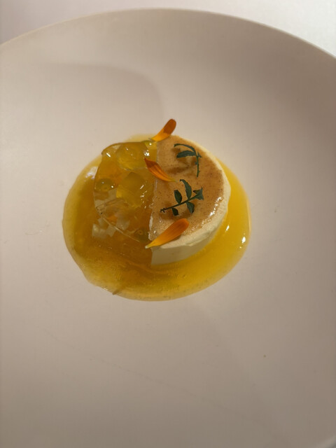 年末も近いので、何か美味しいものが食べたいという事で、ネット予約して、平日の夜に再訪しました。ノーマルのコースですが、相変わらず難解なメニューが提供されます。飲み物は、この1年程ハマっているオレンジワインです。ジョージアとスペインの物がありました。共に美味しかったです♪