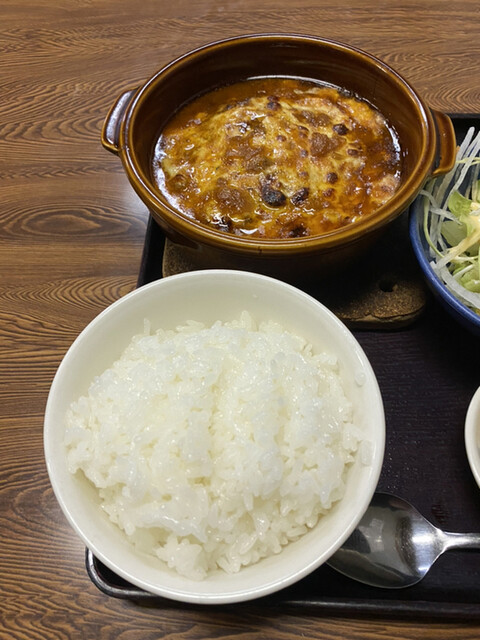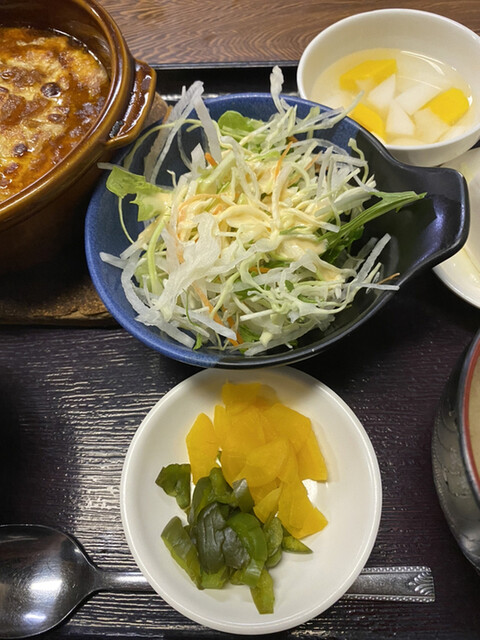 こちらのハンバーグはある意味「飲めハンバーグ」です!それくらいしっかり煮込まれており、柔らかいハンバーグです。ハンバーグに掛かっているチーズも良いですが、一緒に煮込まれたソースも美味しく、これだけでもごはん一杯いけます!もちろんごはんおかわり頂きました!
