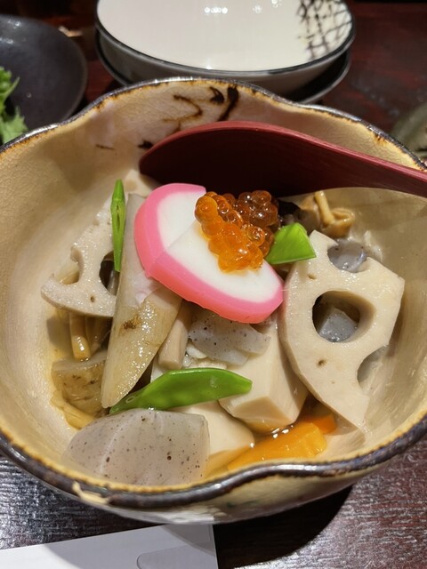 蓮根・里芋・こんにゃく・にんじんなどをお出汁で炊いているのでお煮しめを想像していたら、冷やして上にイクラがのっていたので驚きました。お出汁メインの優しい味付けなので、イクラと一緒に食べた時の塩気と生臭さも程良くアクセントになっていました。
