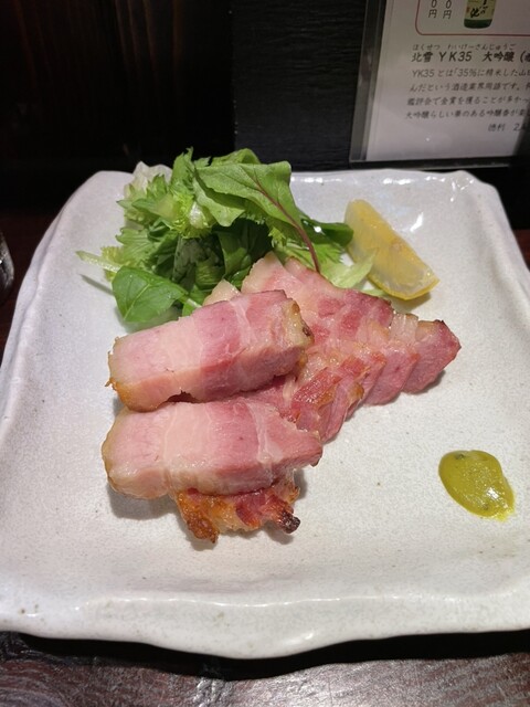 温かいお料理も食べたくなり注文しました。脂がジューシーなベーコンはそのままでももちろん美味しいのですが、添えられた柚子胡椒の少し青さを感じる柑橘の香りがベーコンの油や塩気によく合って楽しかったです。