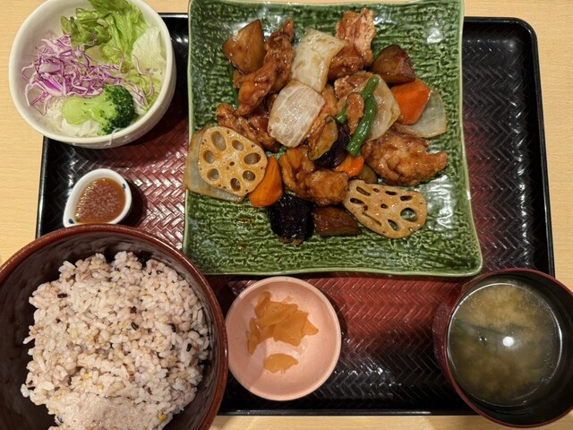 鶏と野菜の甘酢あん定食(おかず増量版)1,140円。