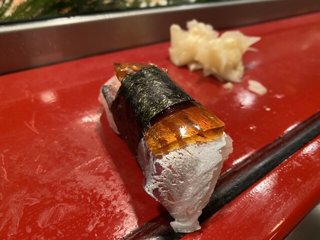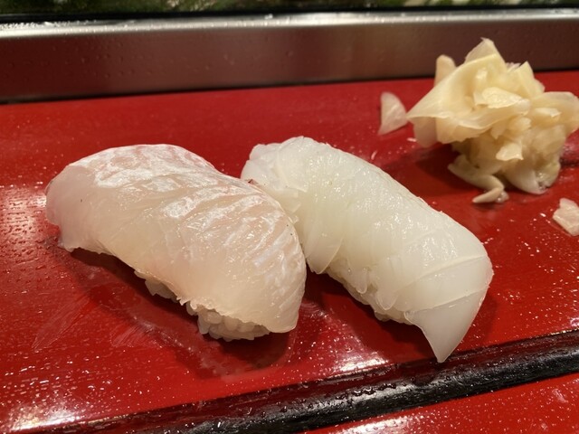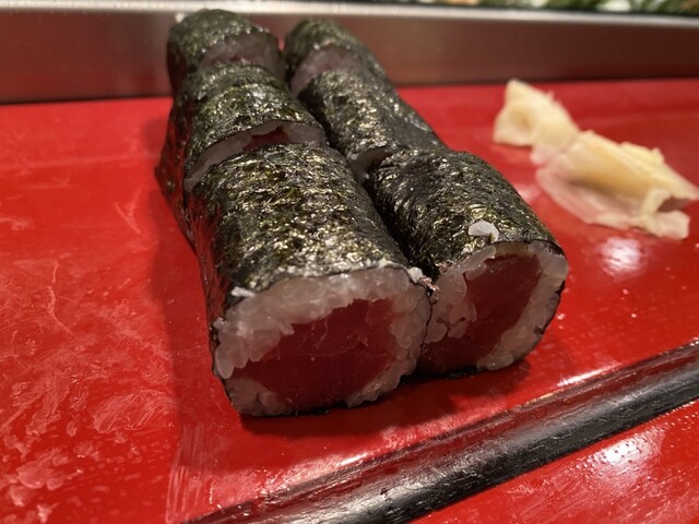 20分程度店内で待ち、ようやく順番が回ってきました。たまたま大将前に通され、赤い付け台に握りが置かれる度に「ハイッ」と小気味の良い掛け声で少し尻込み、、、