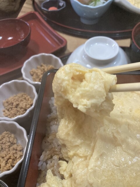 湯気たちのぼる ふわっふわのだし巻きとご飯をそのままでも良し、薬味(ネギノリ大根おろし)や選べるトッピング(鶏そぼろ、明太子など)と出汁をかけて食すもまた良し。