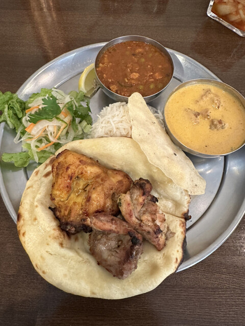 平日昼間に訪れた私はタンドーリランチセットを注文。セットのカレーはバターチキン。さらに私はカレーを1種類追加しました。セットにはタンドーリーチキンにチキンティッカ、ハーフサイズのナンとハーフライス(私はビスマティライスを選択)がついています。調味料はチャツネ、アチャール、黒蜂蜜が卓上に置いてあります。