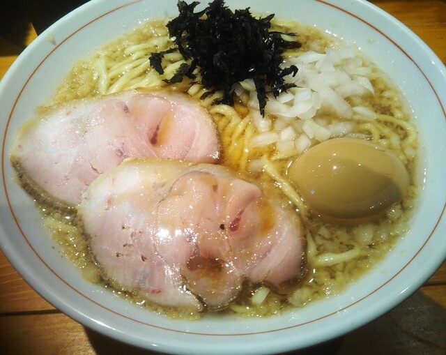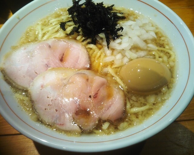 大崎駅まで来たので和市さんにうかがいました。今日は味玉背脂煮中華そばを醤油で注文し待つことに。中華そばは、煮干しから丁寧にとったス―プに背脂が程よく混ざり、玉ねぎや岩のりのアクセントが癖になります。中太麺と良く絡みとても美味しくいただきました。