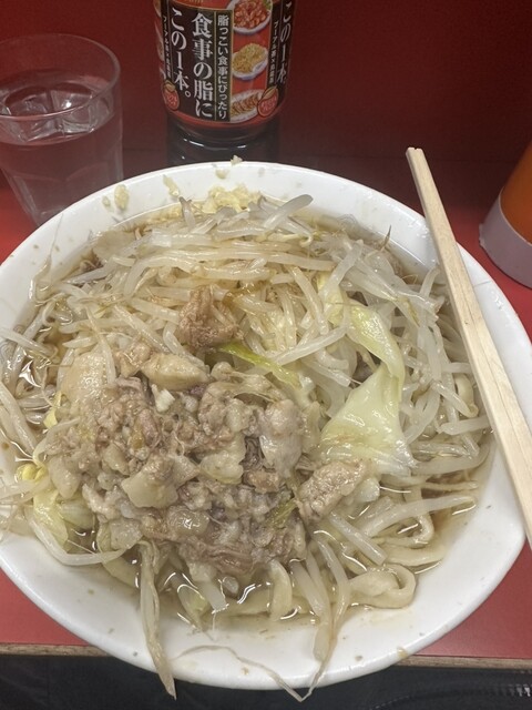 濃厚でパンチあるラーメンの代表格。極太の麺は噛み応えがあり、もっちりとした食感が印象的。豚骨醤油ベースのスープは脂とニンニクの旨味がガツンと効き、好みが分かれるがクセになる味わいだ。トッピングの豚は厚みがあり、柔らかくほぐれる部分としっかりした歯応えの部分が楽しめる。野菜マシにするとキャベツとモヤシが山のように盛られ、ボリューム満点。ラーメンとしての完成度というより、独特の文化と熱量を体感する一杯であり、初めてでも常連でも楽しめる濃厚系ラーメンの王道だ。