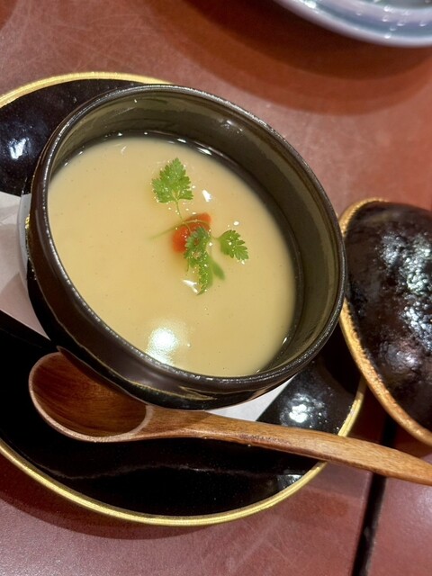 するめいか刺身はねっとりとして柔らか。茶豆は茹でたてであったか、固めの歯応え感。とうもろこしの天ぷらは甘く小粒でしっかりした実で歯応えあります。とうもろこし茶碗蒸しはとうもろこしのポタージュスープが茶碗蒸しになった感じで胡椒あんの刺激があいます。メインのお寿司もいつも美味しい。