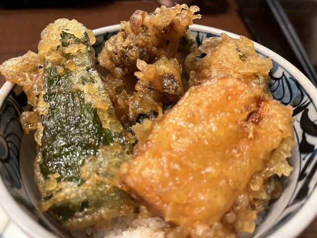 穴子天丼ハーフも太刀魚も野菜の天ぷらも入っていてサクサク天ぷら。下手な所だと魚の臭みが気になっちゃうけどそんな事は勿論ない。魚はふわふわの身で外サクサク。タレは醤油強めで気持ちしょっぱい気もする。蕎麦湯はトロトロ濃厚。