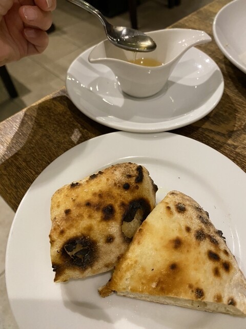 相変わらず、店員さんの接客は抜群にいい!そうそう!この気持ちいのいい接客だったなぁと思いながら、ピザとスズキのレモンクリームソースの釜焼きをオーダー。釜焼きにはフォカッチャが食べ放題で着いているので、ハチミツもお願いしました。