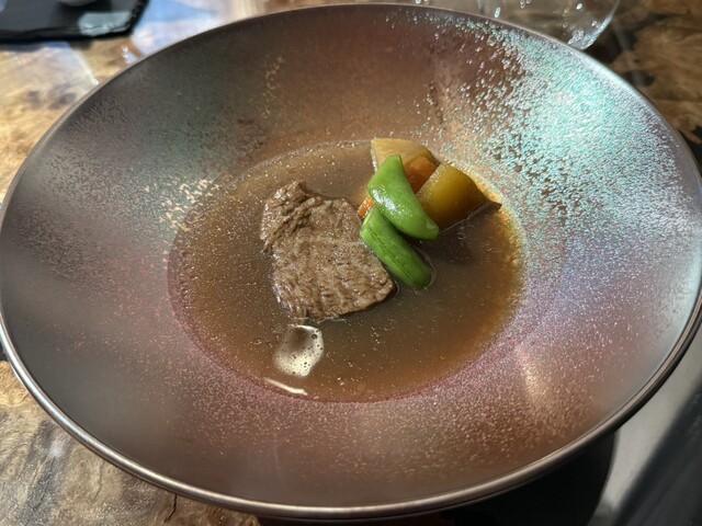 肉料理①は、A5和牛の煮込み。味付けが良い!しっかり煮込んであるので、スプーンで簡単に切れる柔らかさ。マスタードも入れて味変しつつ、美味。美味しい。