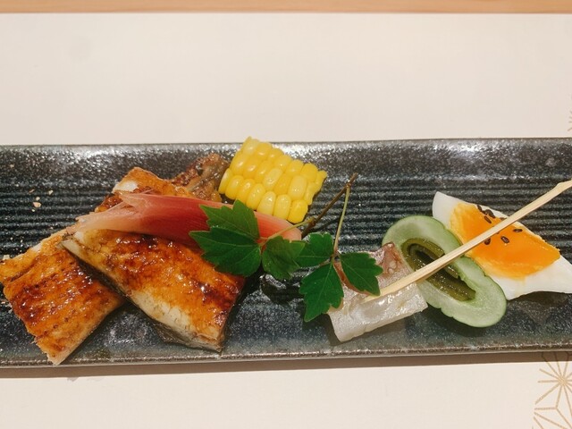 そして、香ばしく焼かれた鰻とトウモロコシが乗った一皿は、夏の風情そのもの。一皿ごとに、全く違う角度から楽しませてくれる。