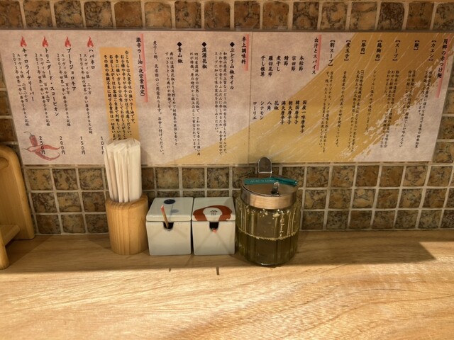 また、赤つけ麺は元々辛味があるのですが、卓上にある2種の山椒や山椒油を加えると一気に担々つけ麺に早変わりして違った味が楽しめます。