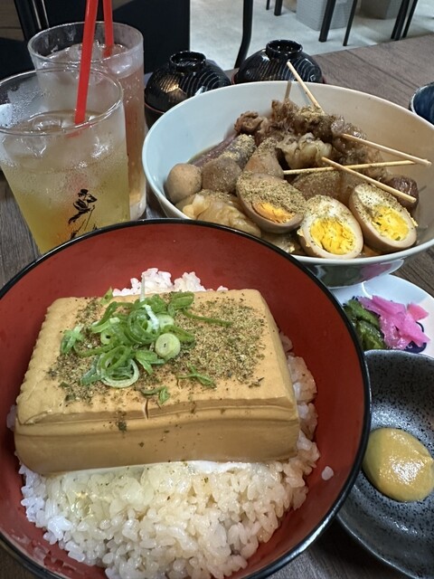 おでんだしをたっぷりかかった豆腐がごはんの上にどーんとのっててなるほどな味!