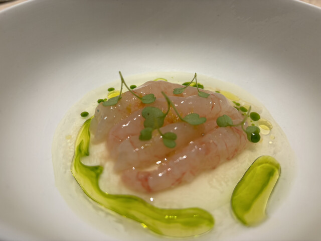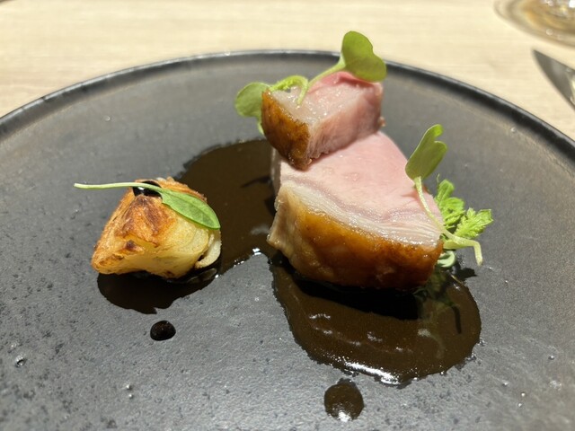 その後も、4日熟成の三国甘海老×ババロア×ルッコラ&トマトオイル。10日熟成の鰆を皮目炭でパリパリにしてもち麦や磯の風味を生かした肴に、メインが黒龍吟醸豚を使った逸品に肉の旨みの効いたソース&大きな百合根←これはなかなか目にみない素晴らしい。