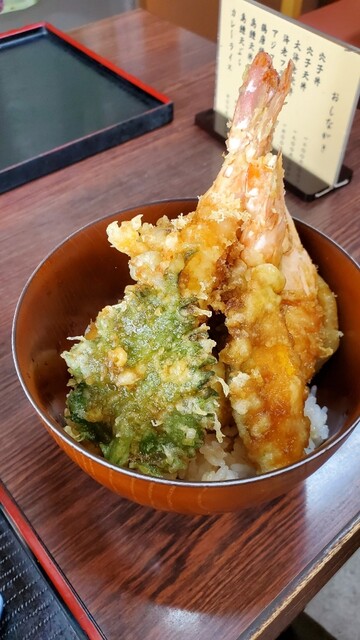 大海老天丼は更に大きな海老が三尾とナス、かぼちゃ、じゃがいも、紫蘇の盛り合わせ。