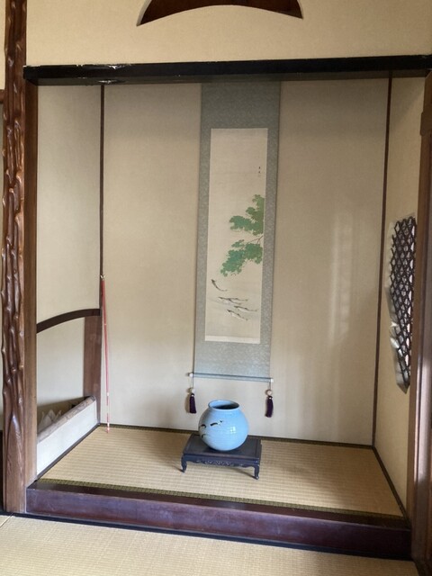 食事をした個室の床間。掛け軸にも壺にもアユが。