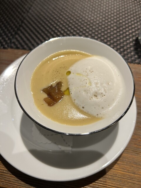 さつまいものポタージュ、りんごの甘煮、メレンゲ?よく混ぜてお召しがり下さい。