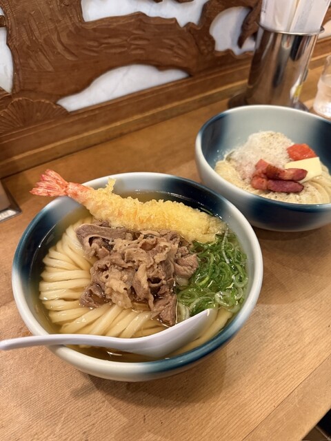 カルボナーラうどん目当てで来店したけど、メニューがたくさんあって、迷ったけど、かけうどんに牛肉+えび天トッピングに!