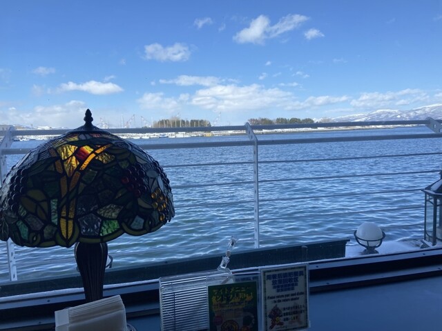 と言ってもレジ3台フル稼働で待ち時間も意外と早く10分ほどでした。しっかり窓際の港が見える席を確保!
