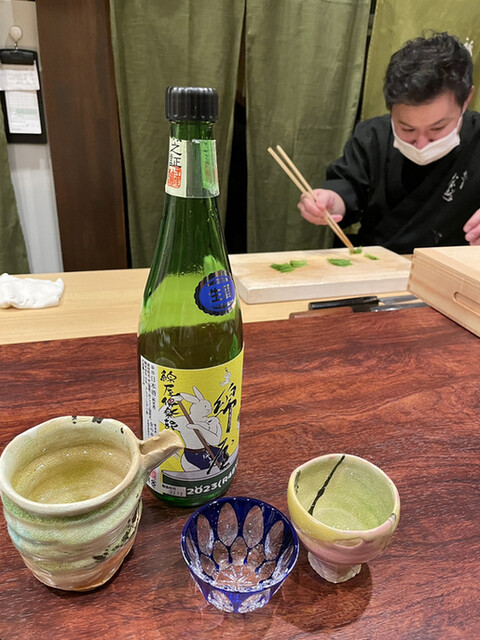 左上に、おすすめの日本酒を。 日本酒って銘柄多くてわからないんですけど、ここでは この日本酒をお代わりしちゃいます。