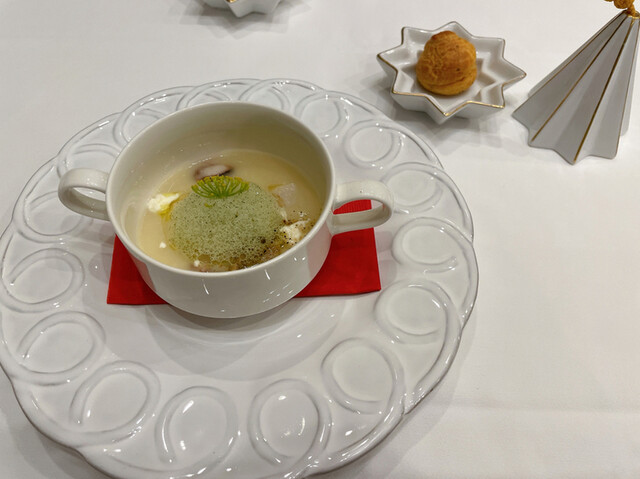 ・ほたて貝柱や真蛸、白神あわび茸などの食材が入っています。メレンゲ風のお茶(玄米茶)がアクセントで、スープは甘味のある繊細なお味。