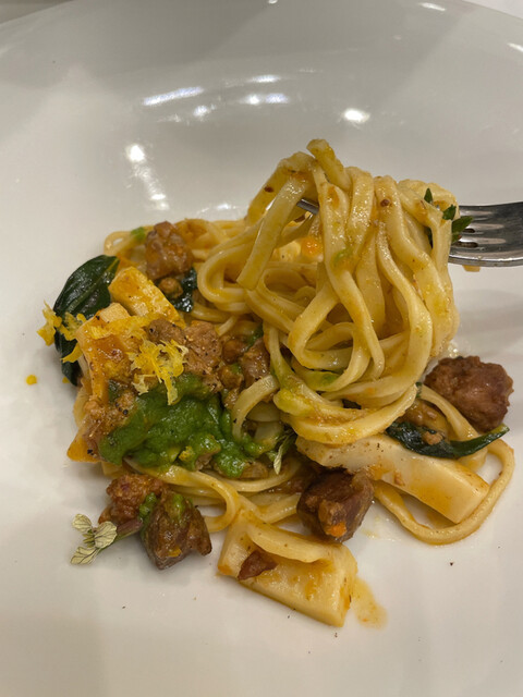 少し変わったルーコラとアーモンドのペーストヴェルデのパスタ。筍を真横にカットしており、歯切りが良くシャキシャキ感が感じれました!