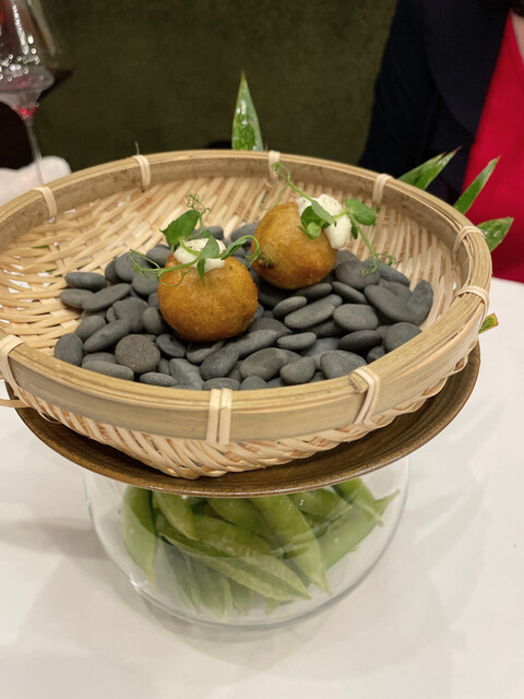 真鯛の白子、春人参のフリットやにんにくの芽、和歌山の加太ひじきなどが添えられてます。
