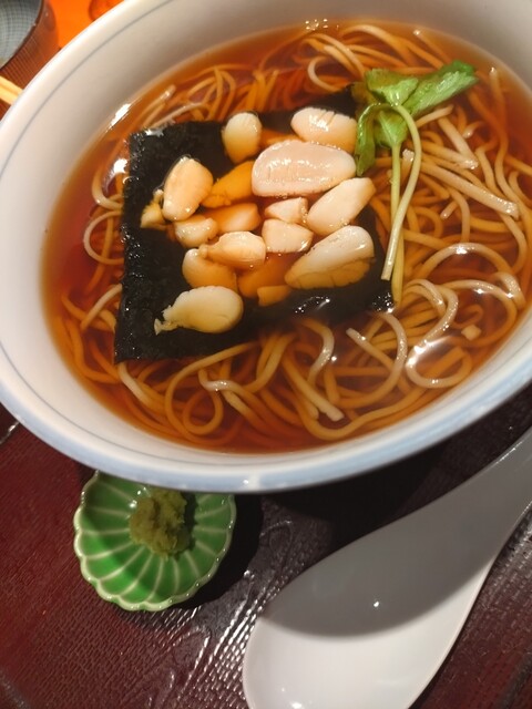 青柳の貝柱の入った蕎麦です。青柳の貝柱から出た出汁もあり、いつもの汁とは違ってると感じます。貝柱も沢山あり、上野藪史上最高価格と思いますが、美味しく頂けました。