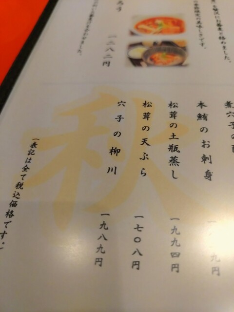 最初にけなしましたが、土瓶蒸しの蓋を開けると、香りが辺りに?漂います。でもこの香り…連れが、ここの松茸の土瓶蒸しを初めて香ったら、つれが…昔からに知ってる香りと思ったらしい。それは谷園のお吸い物の香りだと思ったらしく…ある意味…永谷園の吸い物は凄い商品!勿論違うのは分かると言いっつも、永谷園のお吸い物の完成度は高いと2人では大笑い