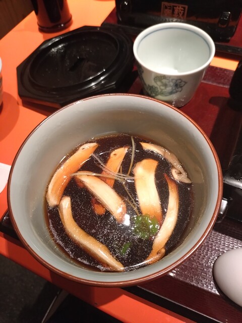 1回目やや湿った土っぽい香り、2回目はそんなの無し、3回目も2回目に近い香りだったと思います。2回目3回目の方が良かったと思います。土瓶が提供された時はそうでもないですが、蓋を開けるとあの松茸の香が感じられ、特にお猪口に注いで、鼻を近づけたり、口に含むと、香が広がります。今年はかの、永谷園のお吸い物とはかなり異なる香りでした。でも毎年、こちらで松茸を頂くと、永谷園 松茸の味お吸い物は凄いな〜って感じます(笑)