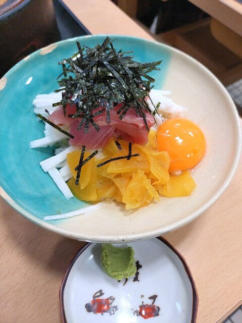 まぐろ赤身、たくあん、山芋、納豆、刻み葱、玉子の黄身です。
