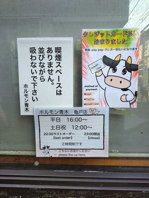 今日、気がついたが、並びの列のビルの窓にメニューが貼ってあった確かにこの場所はホルモン青木さんの作業場?倉庫?今までは並びでも禁煙とかはあったが、メニューは認識してなかったです。しかもクレジットカード払いも始まりました!これは助かりますし、キャッシュレスの流れですね~。