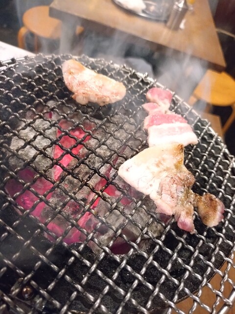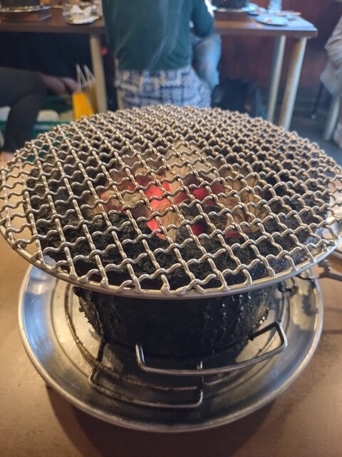 先の2品をオーダーしまずは水を頂きながら肉の到着と到着後は焼き上がるのを待ちます。今日はいつもより火が強く(こちらは備長炭では無いですが炭焼です。七厘で焼きます)豚カルビを焼くと脂が多いため、直ぐに火が上がります。いつも肉と同時に氷をもらい火を鎮火させます。ホルモンも同様です。