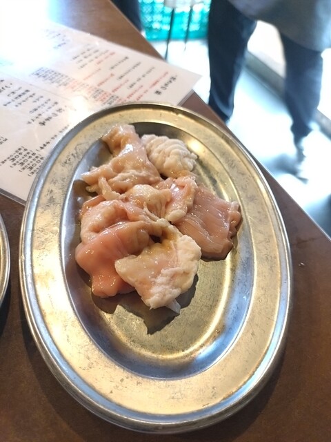 こちらも必ず頼むものの1つ。大蒜醤油で頂く、こめかみの肉の旨さが楽しめるホルモン青木さんで私の1番好きな皿です。立石うちだ さんの かしら薄塩若焼 か かしら若焼お酢 と同じ位美味しくしかもクーポンあるとお得!今日はクーポン無いけど…。こめかみの味と大蒜醤油またはポン酢と頂き大変美味しく頂けました。