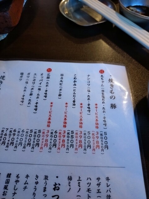 ここのカシラと付いてくるニンニク醤油の浸けだれが旨くて毎回オーダーします。あと豚カルビにはポン酢が付いてきてこれも旨い。何度か伺いこの2つは必ずオーダー。しかも両方ともクーポンで税込398円とかなりお得