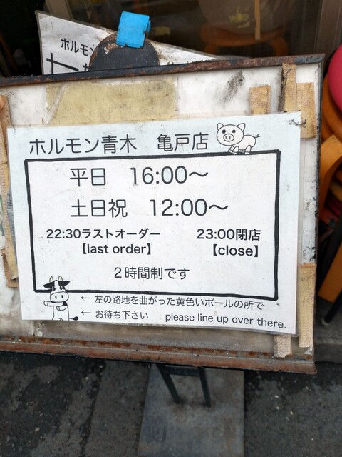 藤棚の季節にあえて藤棚見るためとこちらに訪問のためやってきましたが、ホルモン青木さんの列は普通の日と変わらず、十名程度です。一方、駅からの通り道、亀戸餃子さんは、藤棚時期の名物?最後尾プラカード持った方がいます。でも去年みたく、通常の並びから角で曲がる程ではなく