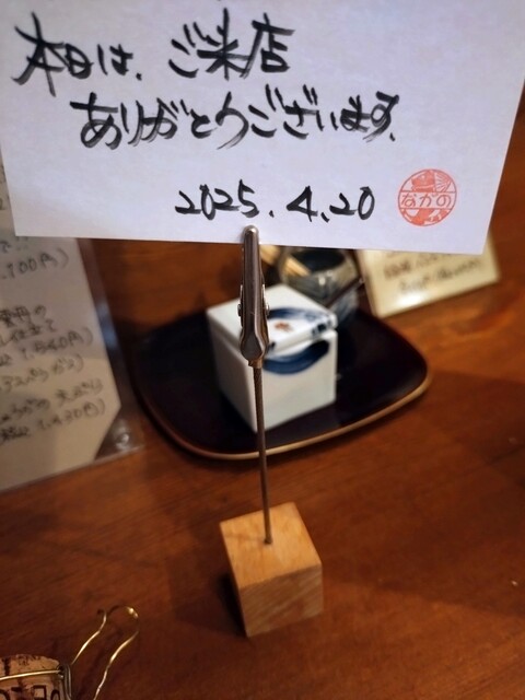 流石はながのさん、本日も予約で満席!やはり予約しないと無理ですね。今回始めて予約してかつコース(¥税抜6,000)をお願いしての訪問。カウンター希望でそこにはウェルカムカードがありました。ただ指定された場所は火に近く、天麩羅、蕎麦の鍋、炭火焼きの炭でかなり暑いので半袖となりました。