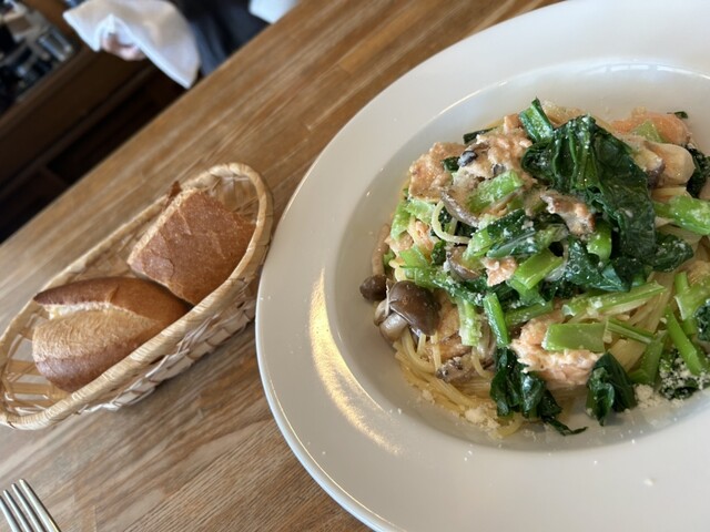 色んなメニューを散々食べて初めてこちらに来た時にオーダーした1番自分好みの小松菜とサーモンのクリームパスタに戻りました☺️