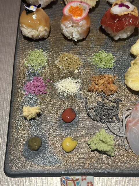 プレートには12種類の塩や薬味が付いていて