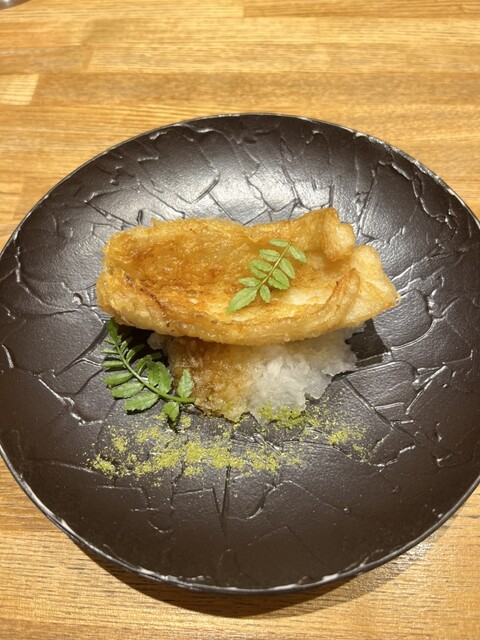 こちらのタチウオのフリットも衣の食感もフワッとして美味しかった。大根おろしが下にあり、木の芽や山椒の粉と共に食べてあっさり美味しい!