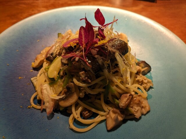 川床シェフのお料理をリクエスト。軽やかで、にんにくオイルの塩梅も良いですね。