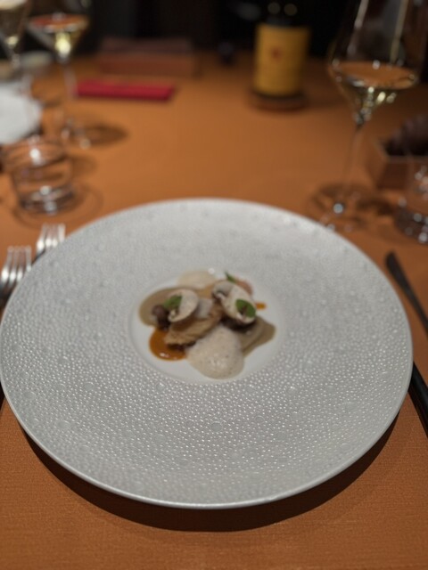 最初はシャンパンで乾杯し、その後はワインのペアリングコースを選択。ペアリングの完成度が非常に高く、料理との相性も完璧。接客も無駄がなく丁寧で、星付きレストランらしい心地よい距離感です。