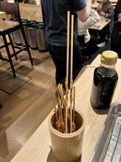 この店名物のジャイアント串カツは5枚目から7枚目になります。比較して通常サイズのだし巻き卵も注文しようかと思いましたが大きさにびっくりして注文やめちゃいました。ただ串をみればわかるかと思いますが通常サイズの2倍ほどあります!