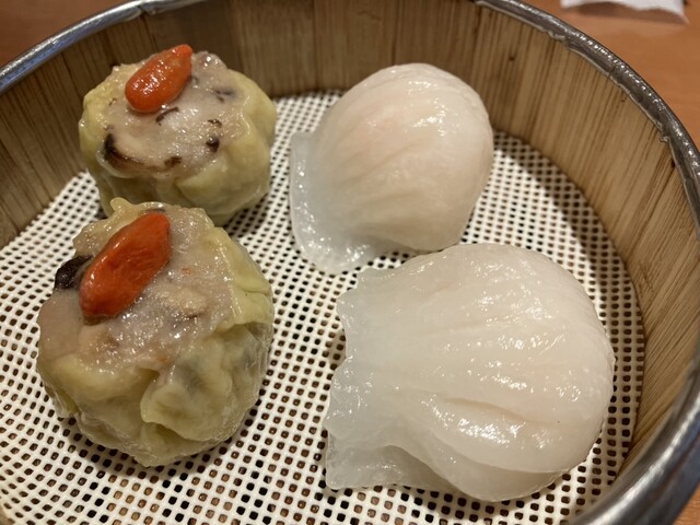 コース4品目と5品目です。こちらは1人1セイロで提供されます。まず海老と豚肉の広東餃子は椎茸の出汁がすごく、ぷりぷりで美味しく、広東風海老蒸し餃子は海老が大きく食べ応えがありました!