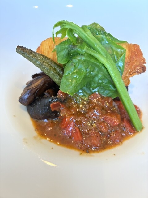 スープは塩味強め自家製パテと生ハムの山盛りサラダサラダ仕立てではなくしっかりとパテドカンパーニュを味わえる1皿が望ましい。主菜鴨胸肉のローストソースの苦味は不要、コク深み味わいのあるソースが望ましい
