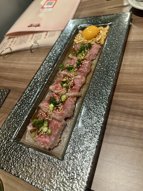 お通しの菜の花とキムチを合えたもの、和牛のたたき、カルパッチョ、辛くないお料理もとても美味しかったです。特に和牛のたたきがとても好みの味でした。